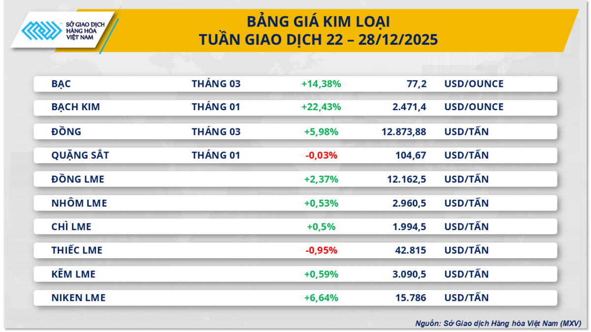 Trong khi đó, không nằm ngoài xu hướng chung của toàn thị trường, nhóm nông sản cũng ghi nhận lực mua tích cực trong tuần giao dịch có nghỉ lễ Giáng sinh. Trong đó, mức tăng rõ rệt nhất có thể thấy ở hai mặt hàng lúa mì.