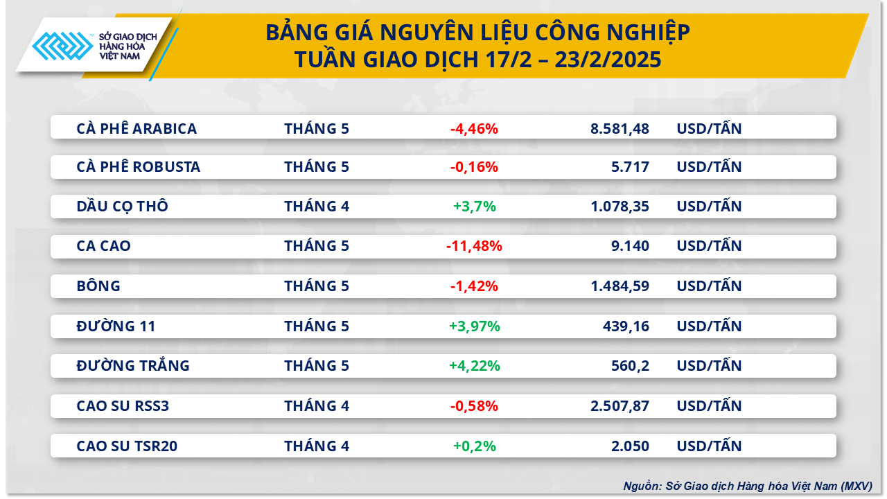 Thị trường nguyên liệu công nghiệp vừa trải qua một tuần giao dịch với diễn biến phân hóa. Tuy nhiên, lực bán mạnh trên thị trường ca cao và cà phê đã kéo chỉ số MXV-Index nguyên liệu công nghiệp giảm mạnh tới 3,65%. Chốt tuần, giá ca cao lao dốc hơn 11%, xuống còn 9.140 USD/tấn. Đáng chú ý, kết phiên giao dịch ngày thứ Sáu (21/2), giá mặt hàng này bất ngờ giảm còn hơn 8.900 USD/tấn - mức thấp nhất kể từ tháng 3/2024.