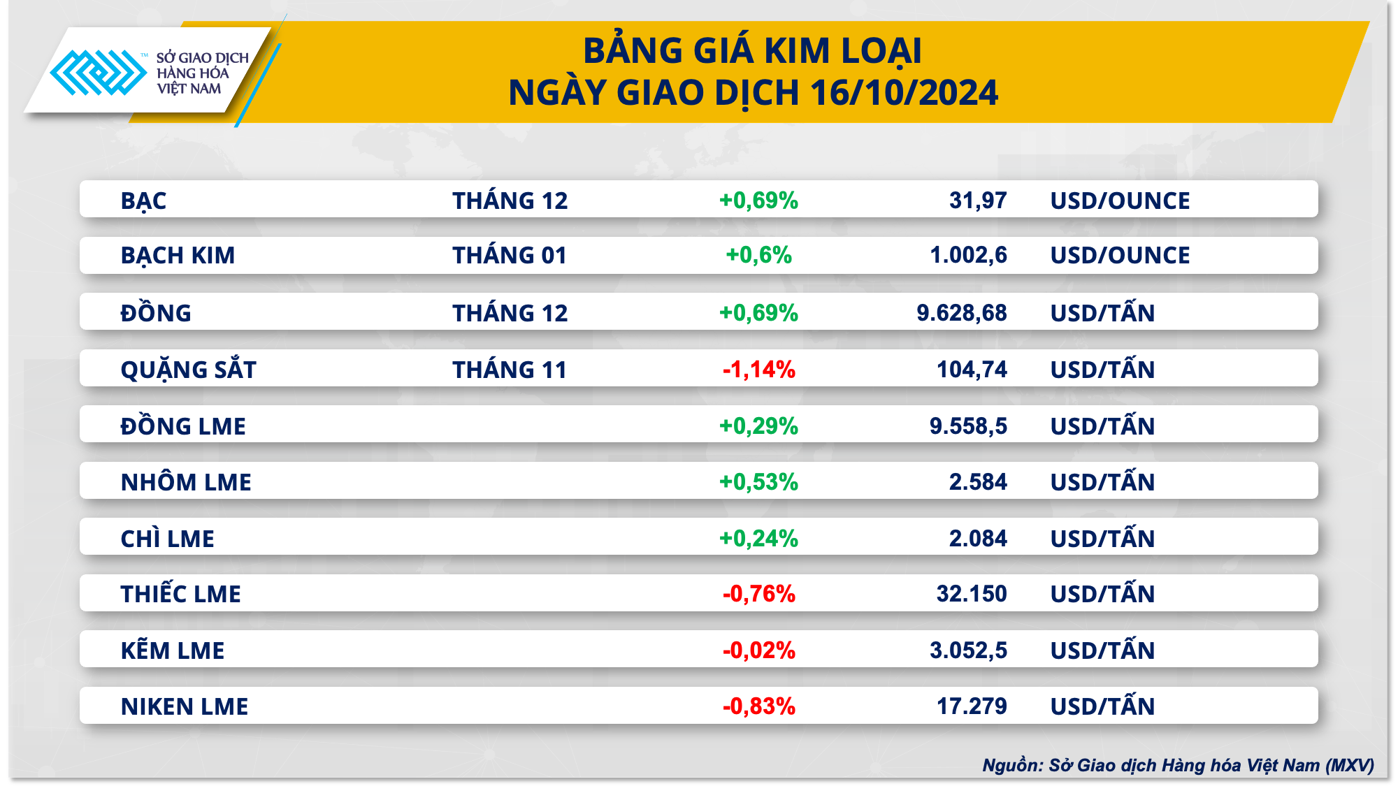 Theo MXV, sắc xanh đã dần quay trở lại bảng giá kim loại trong ngày giao dịch hôm qua với 6/10 mặt hàng tăng giá, sau hai phiên giảm liên tiếp trước đó. Ở nhóm kim loại quý, giá bạc và bạch kim cùng tăng khoảng 0,6%, lần lượt đóng cửa ở mức 31,97 USD/oz và 1.002,6 USD/oz.