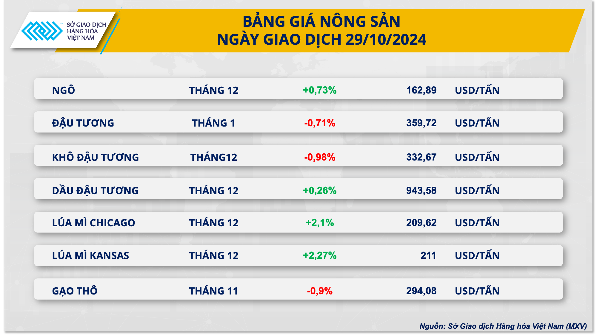 Trong khi đó, giá ngô hợp đồng tháng 12 cũng khởi sắc với mức tăng nhẹ 0,73%, chủ yếu được hỗ trợ bởi đà tăng mạnh của giá lúa mì, bất chấp tình hình mùa vụ tại Mỹ khá tích cực.