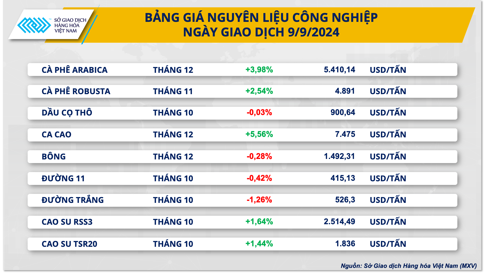 Hầu hết các mặt hàng đều lấy lại sắc xanh tích cực. Đáng chú ý, giá nhiều mặt hàng trong nhóm nguyên liệu công nghiệp và kim loại tăng mạnh như: giá cao cao tăng gần 5,6%; cà phê Arabica tăng 2,5%, cà phê Robusta tăng gần 4%, bạch kim tăng hơn 3%... Đóng cửa, chỉ số MXV-Index tăng 0,86% lên 2.078 điểm.