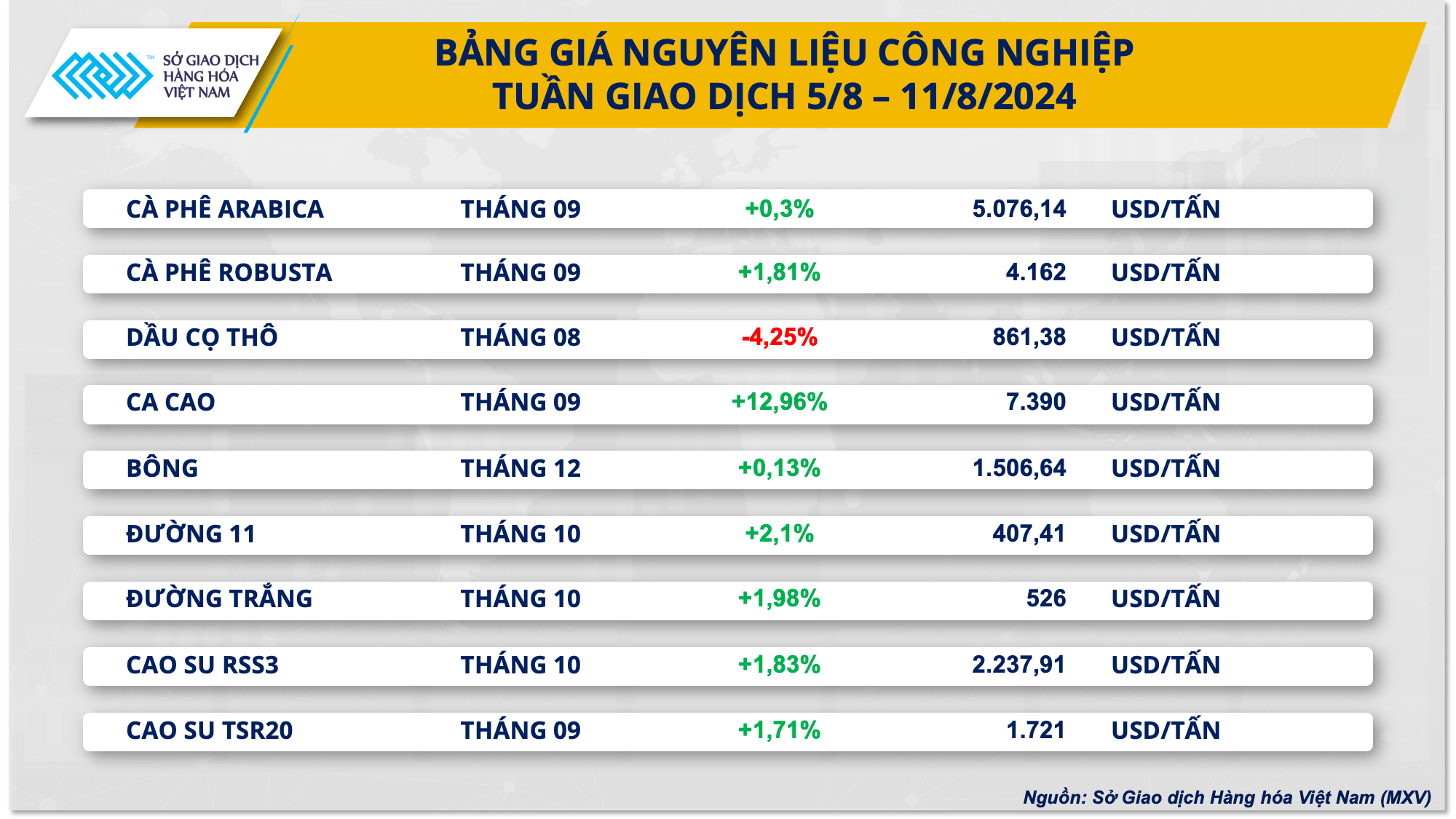 Một diễn biến khác trên thị trường nguyên liệu công nghiệp đã thu hút sự chú ý đặc biệt của các nhà đầu tư là giá ca cao. Đóng cửa, giá mặt hàng này tăng vọt gần 13%, lên mức cao nhất trong gần hai tháng. Hiện nguồn cung đang thiếu hụt và nguy cơ dịch bệnh tăng cao tại hai quốc gia sản xuất chính là Bờ Biển Ngà và Ghana. Các nhà xuất khẩu mặt hàng này ước tính, đến ngày 4/8, lượng ca cao đến các cảng Bờ Biển Ngà ở mức 1,67 triệu tấn, giảm 26,8% so với cùng kỳ mùa trước. Các nhà xuất khẩu cũng điều chỉnh lượng hàng cập cảng vào năm ngoái từ 2,29 triệu tấn xuống còn 2,27 triệu tấn.
