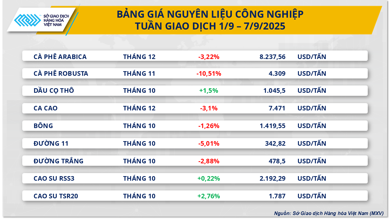 Theo ghi nhận của MXV, nhóm nguyên liệu công nghiệp gây chú ý khi giá hai mặt hàng cà-phê đồng loạt giảm sâu trong tuần qua. Trong đó, giá cà-phê Robusta giảm 4/5 phiên, Arabica giảm 2/5 phiên. Kết tuần, giá Arabica kỳ hạn tháng 12 đánh mất 3,22% xuống 8.237 USD/tấn, giá Robusta kỳ hạn tháng 11 lao dốc 10,5% xuống 4.309 USD/tấn - mức giảm mạnh nhất trong nhiều tháng.