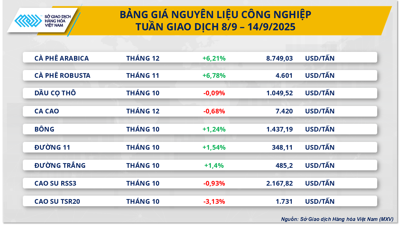 Khép lại tuần giao dịch vừa qua, thị trường nguyên liệu công nghiệp chứng kiến lực mua áp đảo đối với hai mặt hàng cà phê. Đóng cửa tuần, giá cà-phê Arabia ghi nhận mức tăng hơn 6,2% so với tuần trước, lên mức 8.749 USD/tấn, trong khi giá cà-phê Robusta còn tăng tới gần 6,8% lên mức 4.601 USD/tấn.