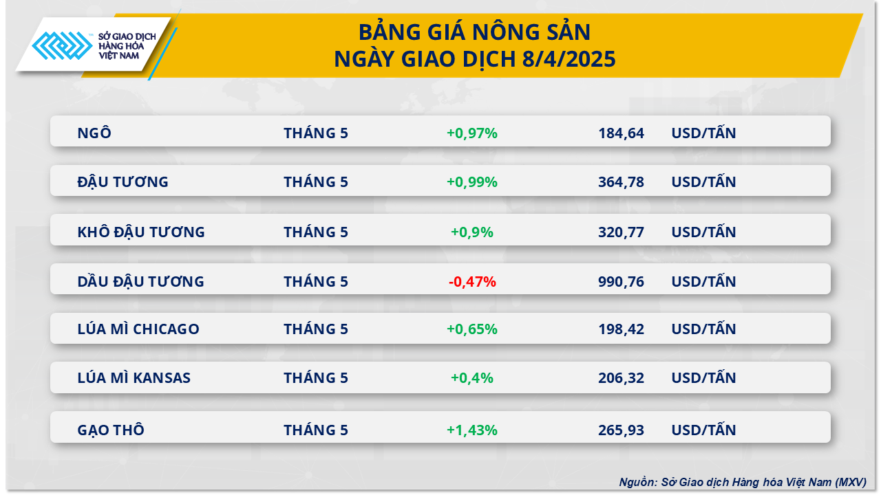 Đối với các mặt hàng thành phẩm của đậu tương, giá khô đậu tiếp tục hồi phục từ vùng giá thấp nhất trong gần 5 năm. Ngược lại, dầu đậu giảm giá phiên thứ tư liên tiếp mặc dù nhận được thông tin hỗ trợ tích cực từ đề xuất mức pha trộn diesel sinh học ở Mỹ là 5,25 tỷ gallon, thấp hơn dự đoán nhưng vẫn cao hơn 64% so với mức hiện tại. Đặc biệt, thị trường chưa phản ứng mạnh trước thông tin dầu ăn đã qua sử dụng của Trung Quốc có thể nằm trong danh mục hàng hóa bị áp mức thuế 104%.