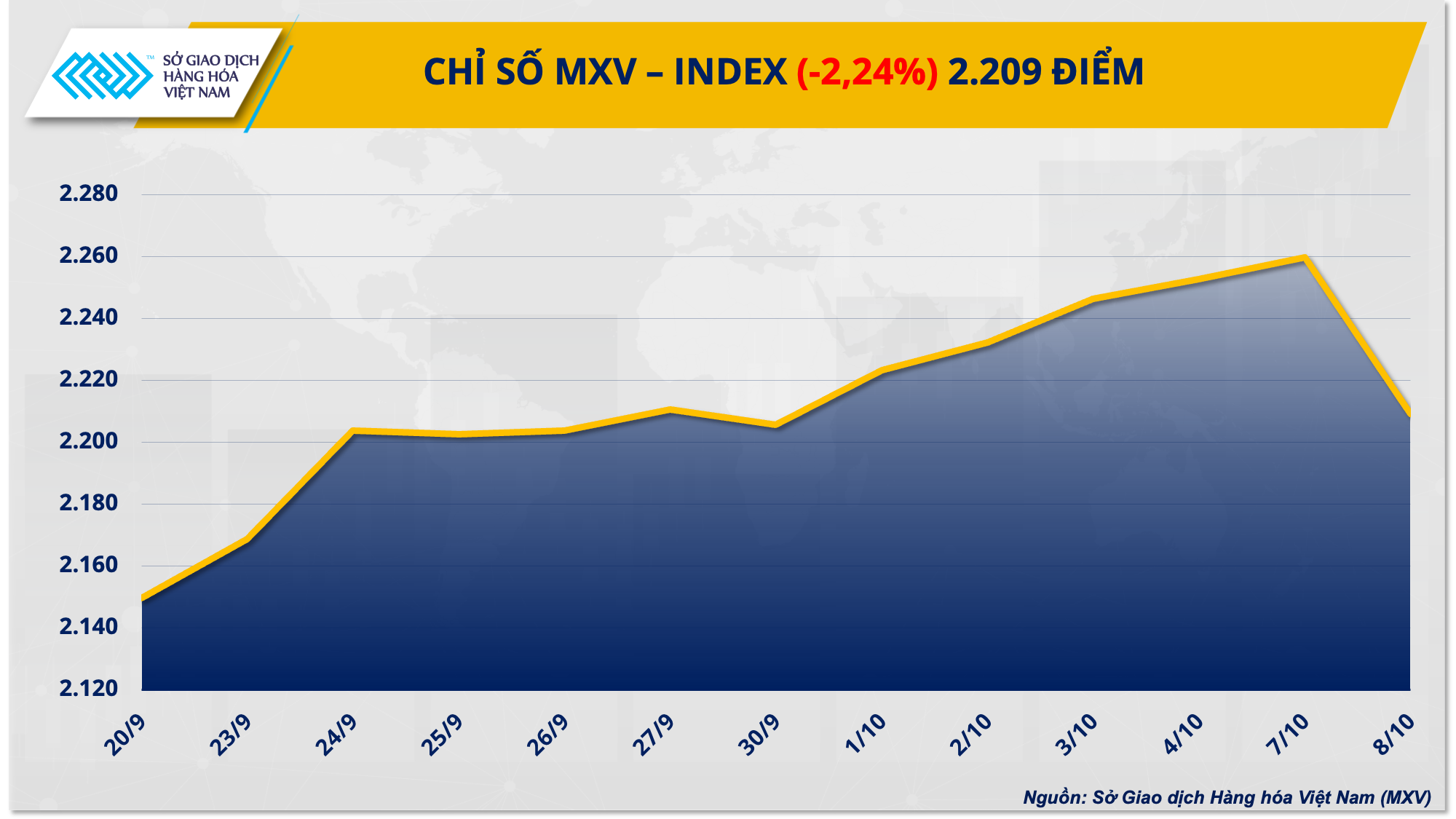 Đáng chú ý, sau nhiều phiên liên tiếp tăng giá, lực bán mạnh đã quay trở lại thị trường dầu thô khiến giá cả hai mặt hàng quay đầu lao dốc. Diễn biến cùng chiều, trên thị trường nông sản, giá ngô và đậu tương cũng suy yếu trong bối cảnh hoạt động thu hoạch tại Mỹ đang đẩy mạnh cùng triển vọng thời tiết thuận lợi cho mùa vụ mới ở Brazil. Đóng cửa, chỉ số MXV-Index đánh mất 2,24% xuống 2.209 điểm.