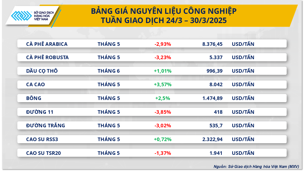 Theo MXV, lực bán chiếm ưu thế trên thị trường nguyên liệu công nghiệp trong tuần vừa qua. Đóng cửa, giá cà phê Arabica giảm tới 2,93%, xuống mức 8.376 USD/tấn, trong khi giá Robusta cũng giảm sâu 3,23% về mức 5.337 USD/tấn. Như vậy, so với mức giá cao kỷ lục đã thiết lập vào tuần giữa tháng 2, giá cà phê Arabica đã đánh mất hơn 1.000 USD/tấn; giá Robusta cũng giảm khoảng 450 USD/tấn.