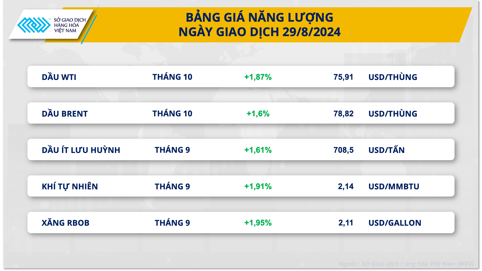Giá dầu bật tăng trong bối cảnh nguồn cung tại Libya bị gián đoạn kéo dài trong khi Iraq chuẩn bị cho kế hoạch cắt giảm sản lượng vào tháng 9. Bên cạnh đó, lực mua cũng chiếm áp đảo trên thị trường nông sản ngay khi Bộ Nông nghiệp Mỹ công bố kết quả xuất khẩu khả quan. Đóng cửa, chỉ số MXV-Index tăng 0,71% lên 2.151 điểm.