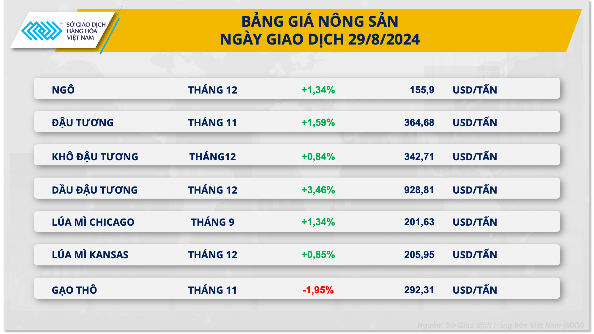 Sắc xanh cũng bao phủ bảng giá hai mặt hàng thành phẩm của đậu tương trong phiên 29/8. Giá khô đậu tương hợp đồng tháng 12 diễn biến khá giằng co. Giá khởi sắc ngay sau khi mở cửa và theo sát với diễn biến giá của đậu tương, nhưng nhanh chóng suy yếu vào cuối phiên trước áp lực chốt lời của thị trường. Tuy vậy, giá khô đậu vẫn ghi nhận mức tăng gần 1% sau khi kết phiên. Trong khi đó, dầu đậu tương là mặt hàng tăng mạnh nhất cả nhóm trong phiên hôm qua với mức tăng lên tới 3,46%.