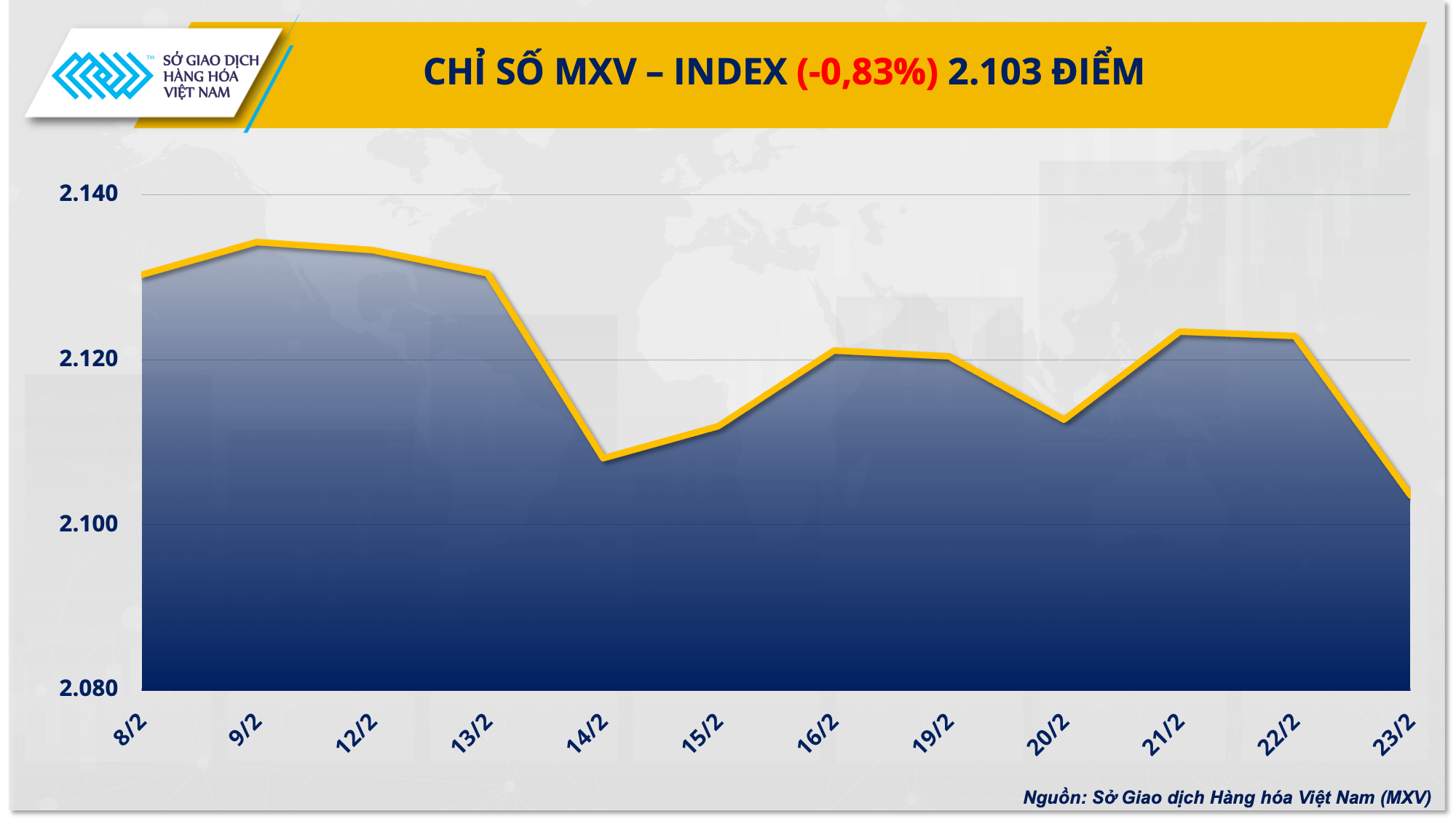 Điều này thể hiện qua sự phân hóa, giằng co rõ rệt giữa các mặt hàng, chỉ số giá nông sản tăng vào đầu tuần và giảm mạnh về cuối tuần trái ngược với xu hướng của nhóm hàng kim loại. Chốt tuần, sắc đỏ chiếm ưu thế trên bảng giá hàng hoá nguyên liệu, kéo chỉ số MXV-Index giảm 0,83% xuống 2.108 điểm. Giá trị giao dịch trung bình toàn sở mỗi ngày đạt hơn 3.900 tỷ đồng.