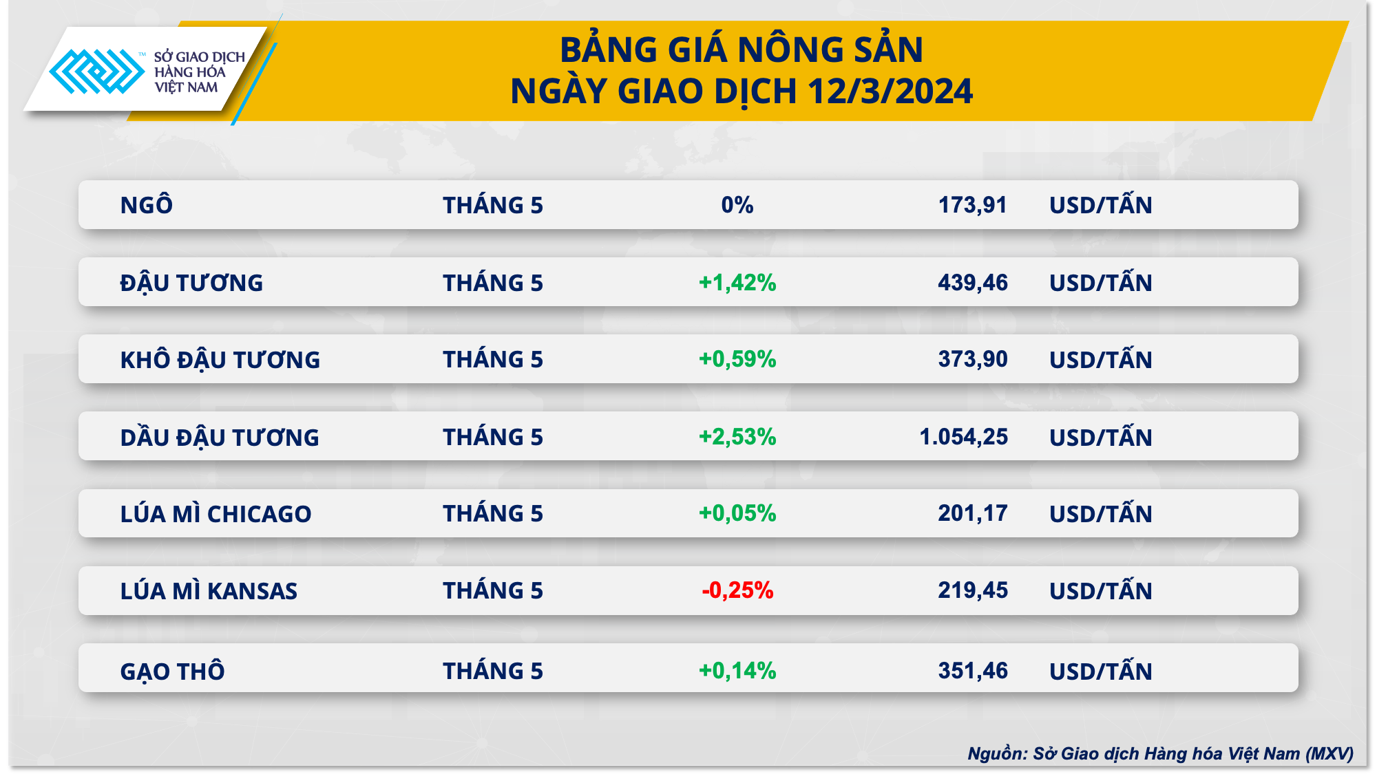 Khô đậu tương cũng kết phiên với mức tăng nhẹ 0,59%. Trong khi đó, dầu đậu tương trở thành mặt hàng tăng mạnh nhất cả nhóm, khi nhảy vọt 2,53% vào hôm qua.