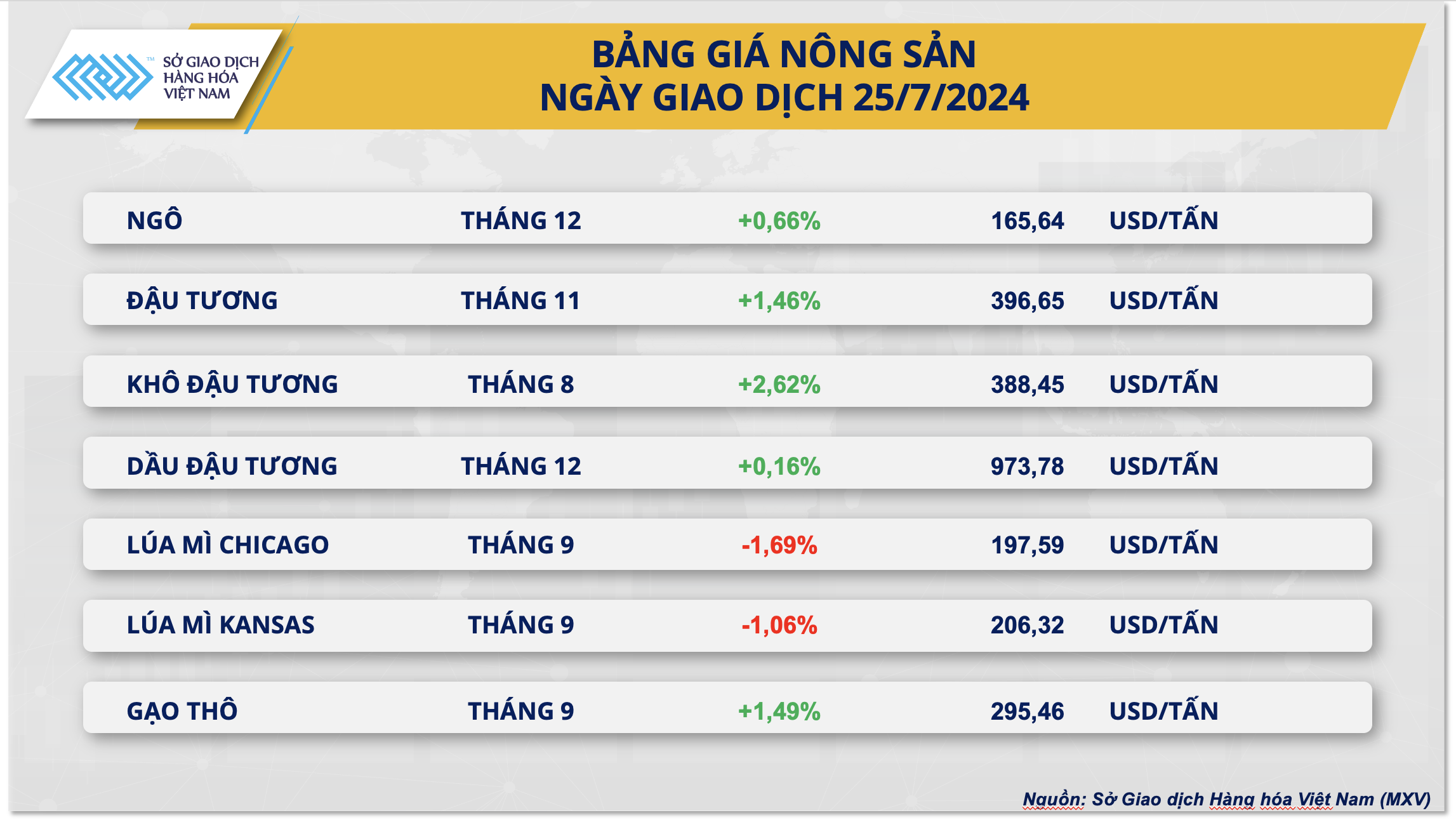 Trong báo cáo Bán hàng Xuất khẩu (Export Sales) hôm qua, Bộ Nông nghiệp Mỹ (USDA) cho biết doanh số bán ngô niên vụ 2024-2025 của nước này trong tuần 12 - 18/7 đạt hơn 745.190 tấn, tăng 53,4% so với một tuần trước và vượt ngoài khoảng dự đoán trước của thị trường. Dữ liệu báo cáo cho thấy nhu cầu quốc tế với ngô vụ mới của Mỹ tăng trưởng mạnh, góp phần hỗ trợ giá mặt hàng này trong phiên hôm qua.