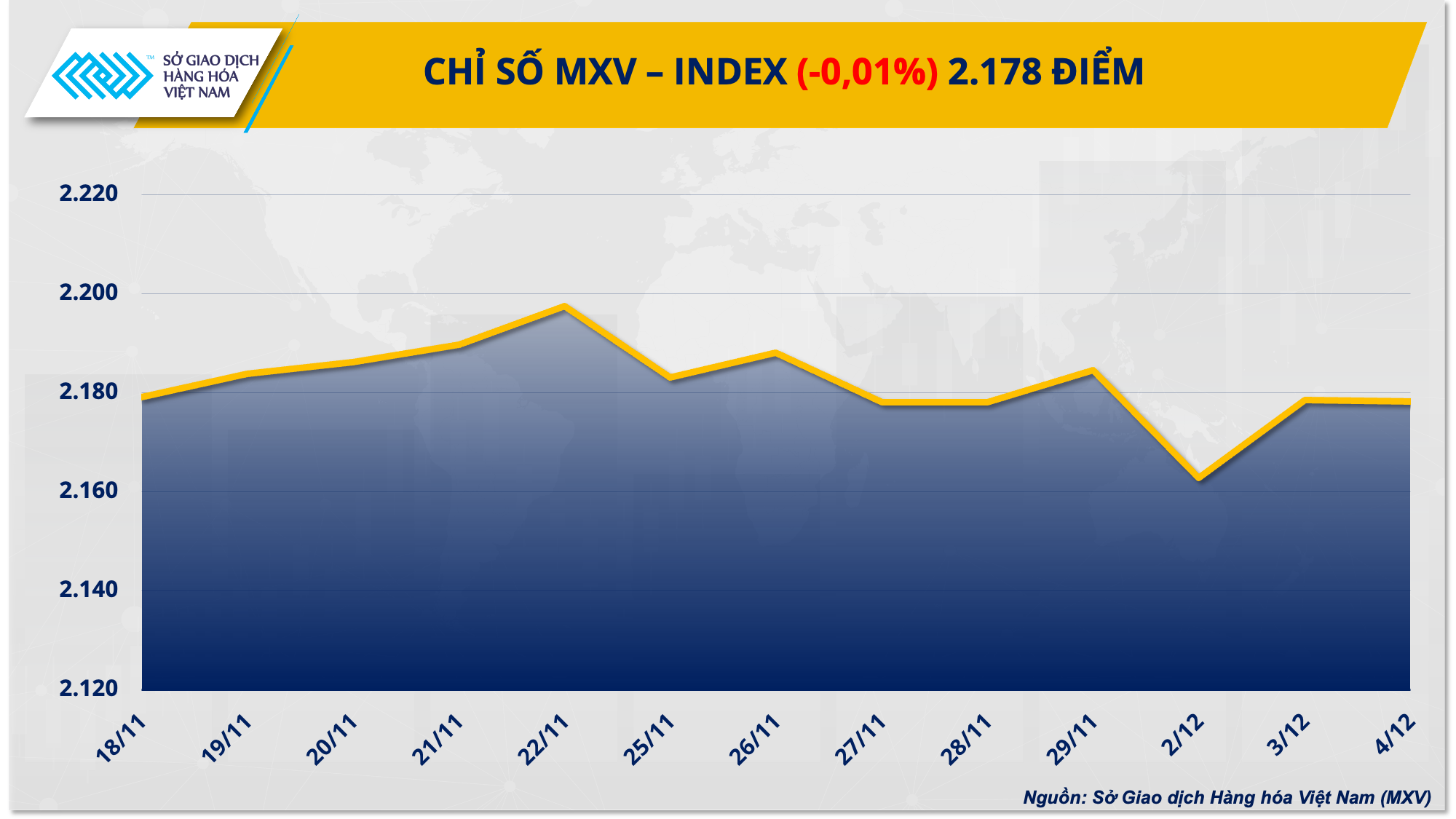 Đóng cửa, chỉ số MXV-Index gần như không thay đổi, vẫn dừng ở mức 2.178 điểm. Hai mặt hàng cà phê tiếp tục gây chú ý trên thị trường nguyên liệu công nghiệp khi quay đầu bật tăng 3% sau ba phiên trượt dốc trước đó. Ngược lại, trên thị trường năng lượng, sau khi nhận những thông tin không mấy khả quan về nền kinh tế Mỹ, giá các mặt hàng dầu thô đồng loại suy yếu.