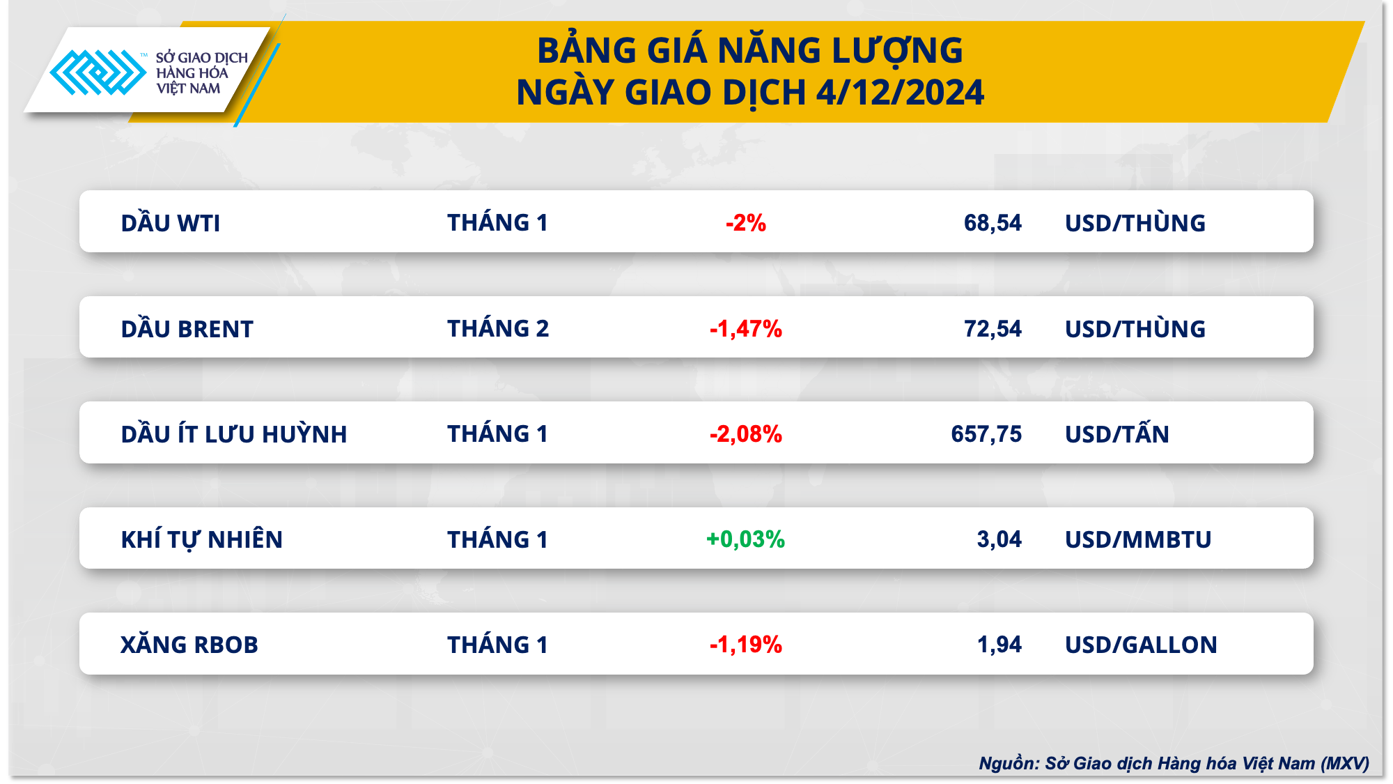 Đóng cửa, giá dầu thô WTI giảm đánh mất 2% xuống còn 68,54 USD/thùng. Giá dầu thô Brent giảm 1,47% xuống còn 72,54 USD/thùng.