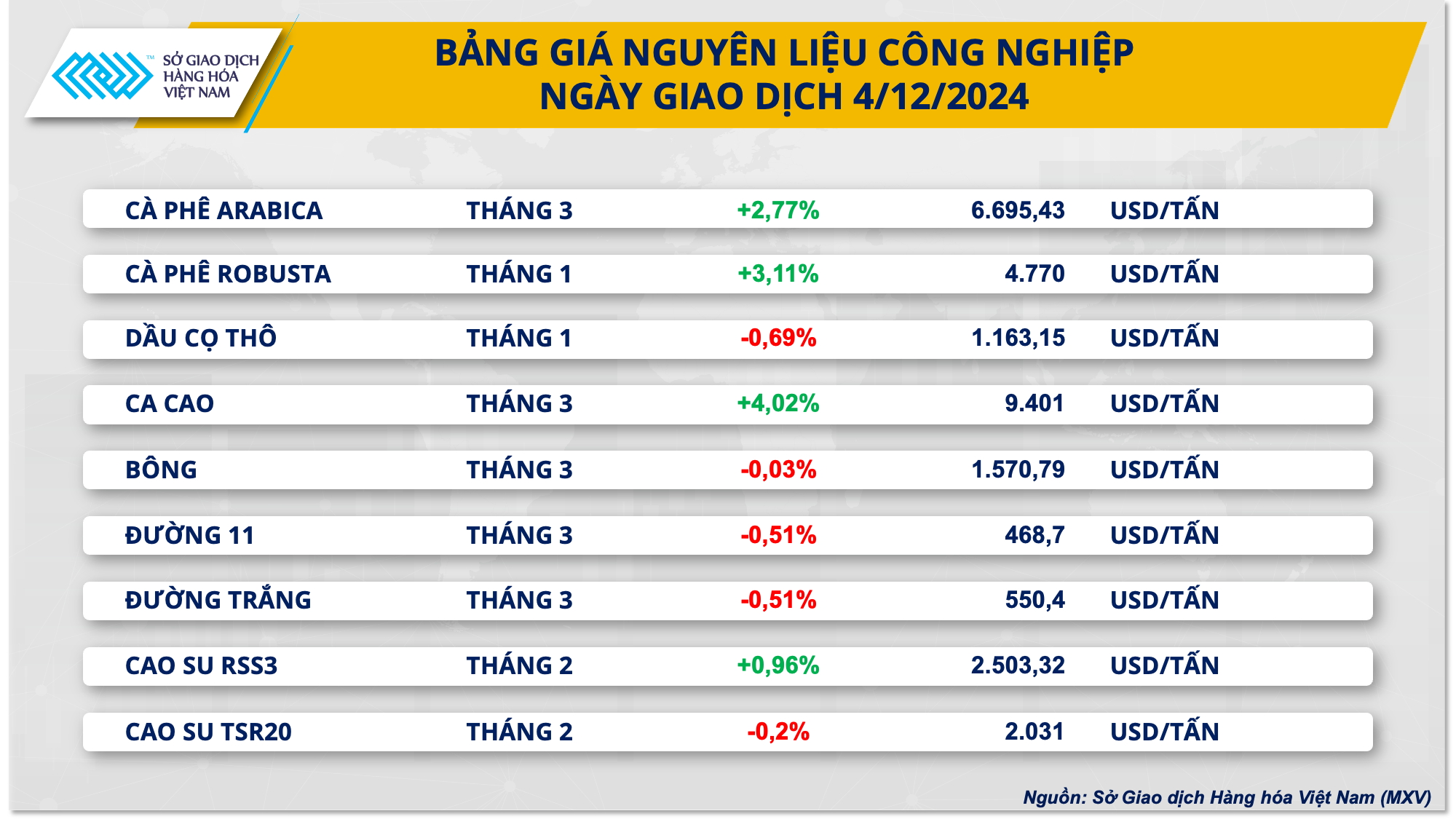 Kết thúc phiên giao dịch ngày hôm qua, bảng giá nhóm nguyên liệu công nghiệp phân hóa rõ nét. Trong đó, hai mặt hàng cà phê nổi bật với sắc xanh khi giá đồng loạt bật tăng sau chuỗi ba phiên giảm liên tiếp. Cụ thể, giá cà phê Arabica tăng 2,8% lên gần 6.700 USD/tấn, giá cà phê Robusta tăng hơn 3% lên 4.770 USD/tấn. Đà tăng được hỗ trợ do lo ngại về nguồn cung tại các quốc gia sản xuất chính.