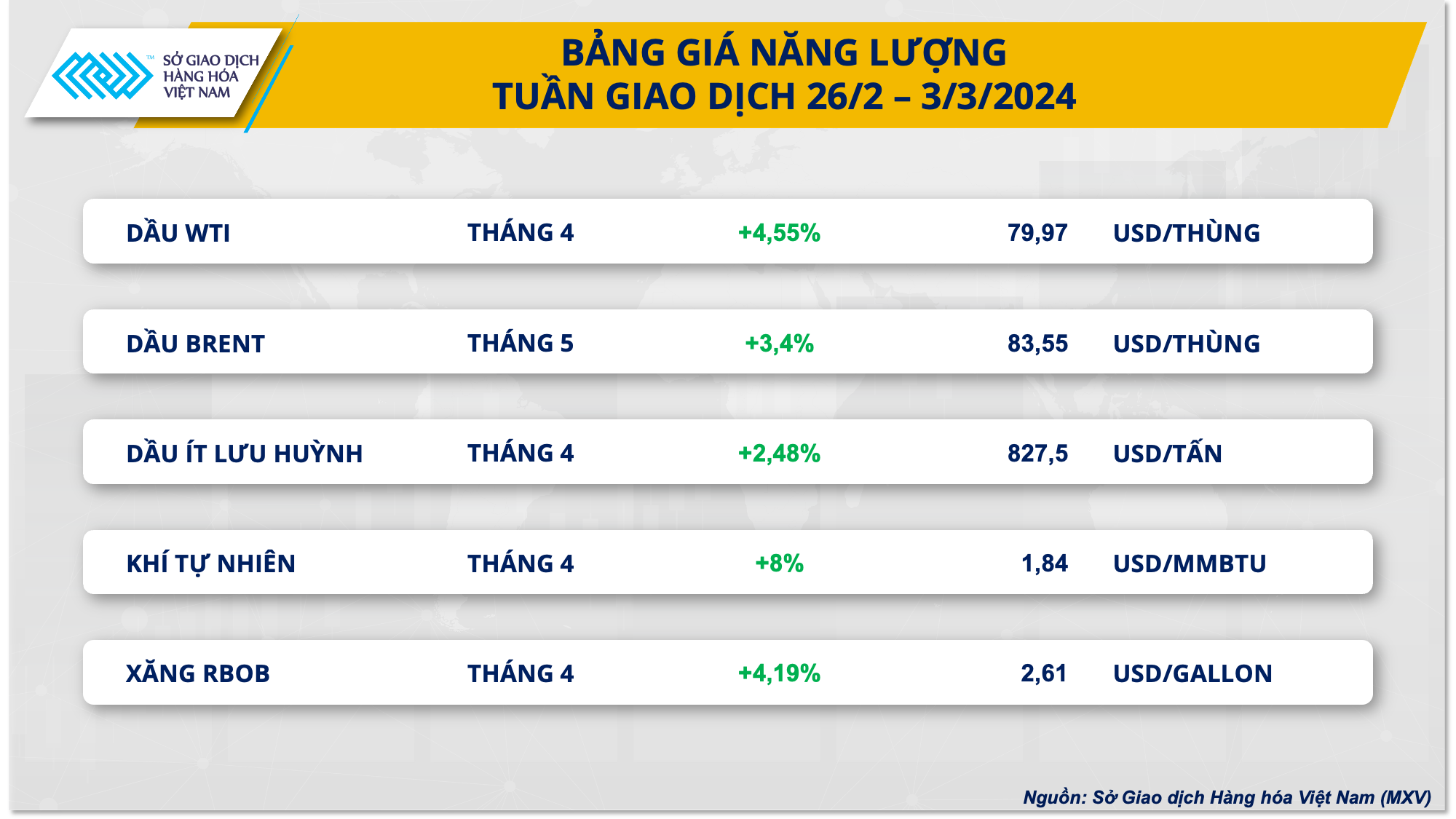 Theo MXV, kết thúc tuần giao dịch 26/2 - 3/3, giá dầu bật tăng vọt sau tuần giảm giá trước đó. Lo ngại nguồn cung toàn cầu thắt chặt là yếu tố chính đẩy giá trong tuần qua.
