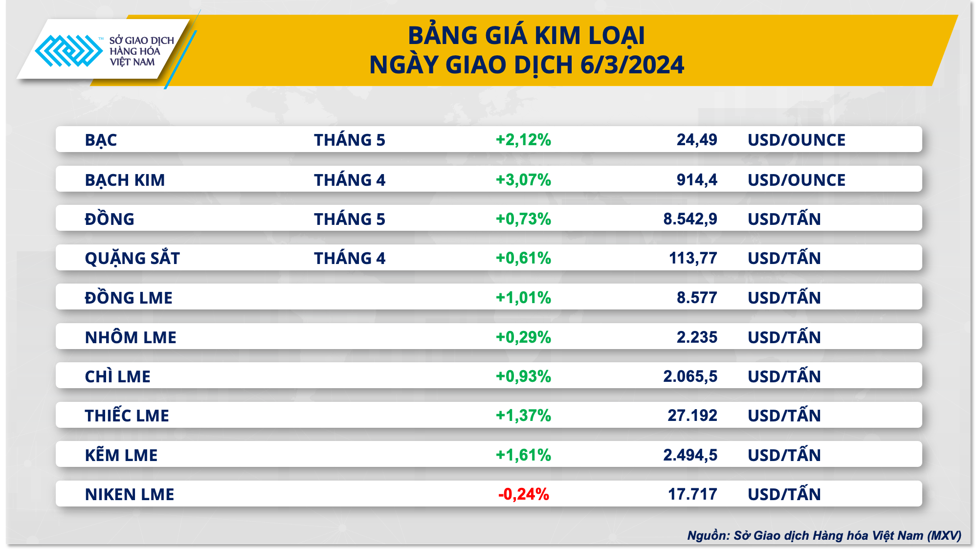 Kết thúc ngày giao dịch 6/3, lực mua quay lại thị trường kim loại nhờ sự suy yếu của đồng USD. Đối với kim loại quý, giá bạc và giá bạch kim đồng loạt phục hồi trong sắc xanh. Giá bạc tăng 2,12% lên 24,49 USD/oz, mức cao nhất kể từ cuối tháng 12/2023. Giá bạch kim chốt phiên tại 914,4 USD/oz sau khi tăng 3,07%. Đây cũng là mức tăng lớn nhất trong phiên của giá bạch kim kể từ giữa tháng 12/2023.
