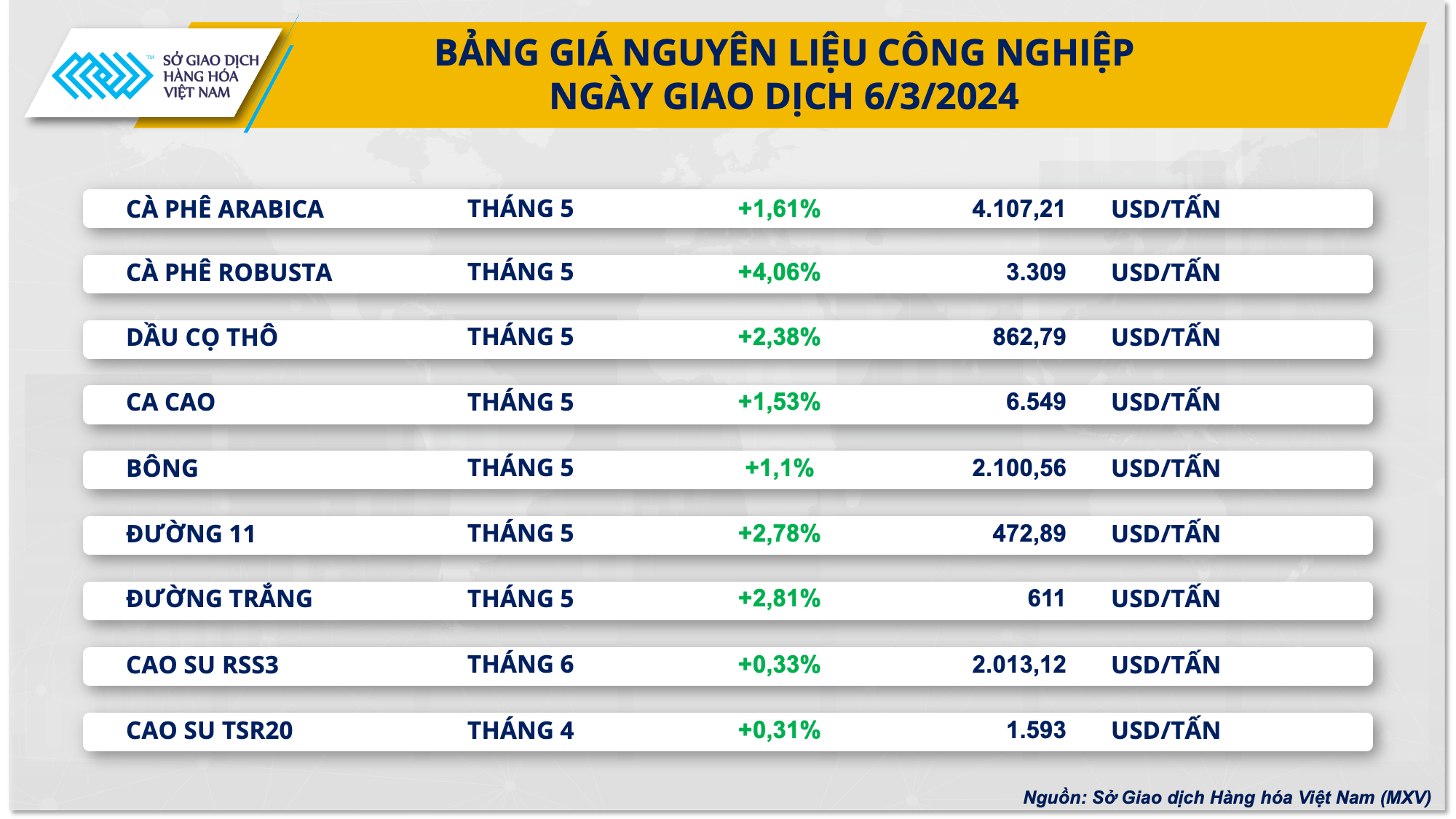 Theo MXV, kết thúc phiên giao dịch 6/3, giá hai mặt hàng cà phê đồng loạt khởi sắc. Trong đó, giá Robusta tăng 4,6%, lên mức cao nhất trong một tháng, giá Arabica hồi phục 1,61% so với tham chiếu. Tỷ giá USD/BRL suy yếu đã lấn át sự cải thiện tồn kho trên Sở ICE-US, từ đó lực mua chiếm ưu thế.