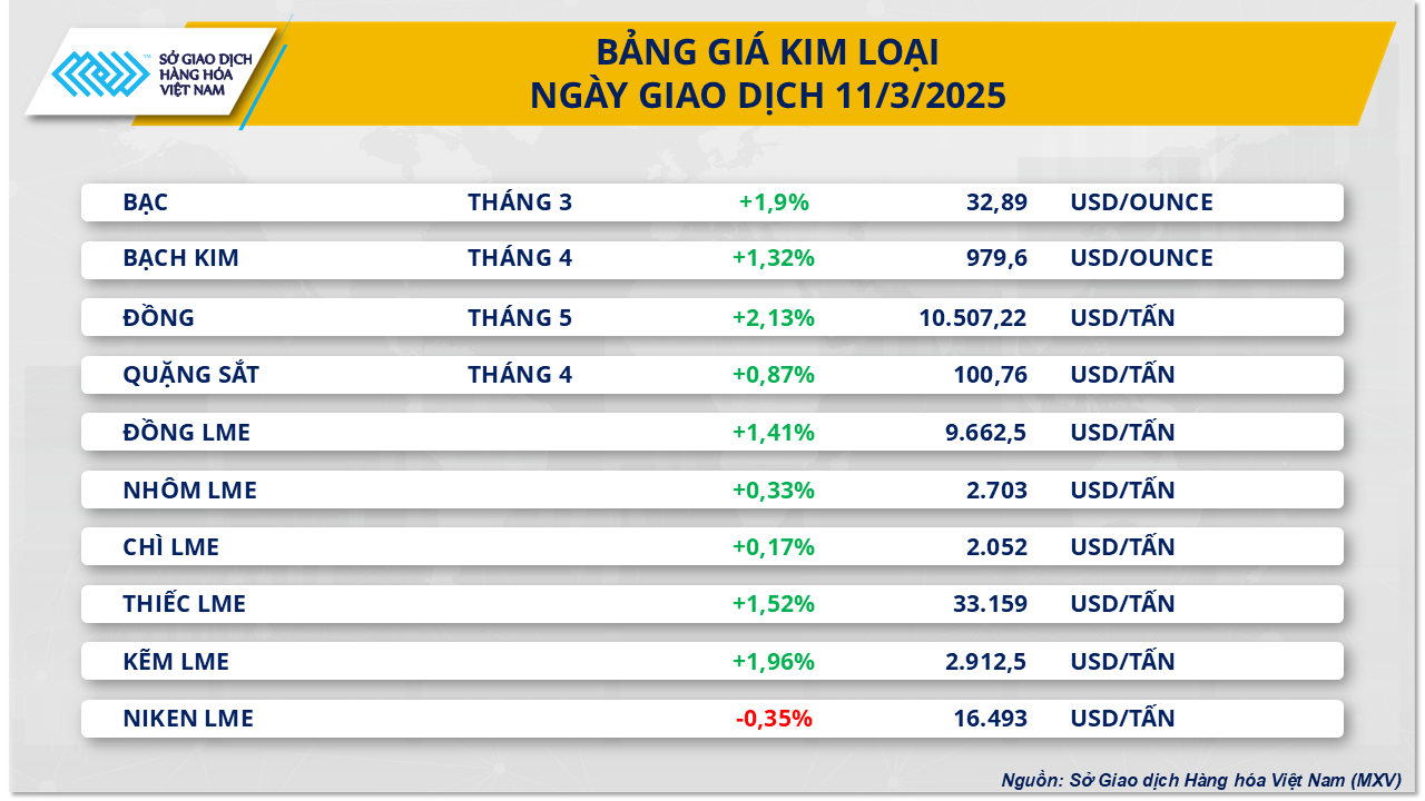 Đối với nhóm kim loại cơ bản, giá đồng COMEX tăng 2,13% lên 4,77 USD/pound (tương đương 10.507 USD/tấn). Đà tăng được hỗ trợ bởi lượng tồn kho giảm mạnh. Theo dữ liệu từ Sàn giao dịch Kim loại London (LME), lượng đồng sẵn sàng giao dịch giảm xuống 136.300 tấn, mức thấp nhất kể từ giữa tháng 6/2023. Giới phân tích nhận định nguồn cung đang được điều hướng sang Mỹ, trong bối cảnh lo ngại chính quyền Trump có thể áp thêm thuế đối với kim loại này, dẫn đến nguy cơ thiếu hụt trong nước.