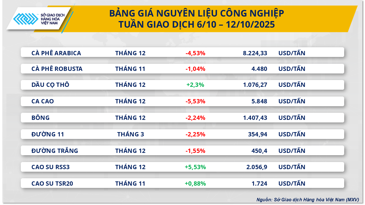 Không nằm ngoài xu hướng chung của thị trường, khép lại tuần giao dịch vừa qua, nhóm nguyên liệu công nghiệp cũng ghi nhận lực bán áp đảo với 6 trên 9 mặt hàng đồng loạt giảm giá. Trong đó, giá cà-phê Arabica đã đánh mất tới 4,5% trong tuần, lùi về mức 8.224 USD/tấn; đồng thời, giá cà-phê Robusta cũng giảm hơn 1% về mức 4.480 USD/tấn.