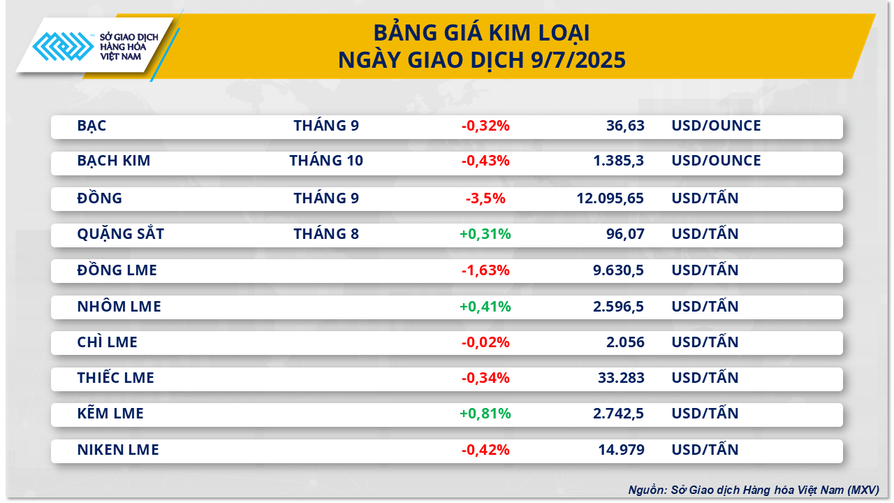 Khép lại phiên giao dịch ngày hôm qua, thị trường kim loại chứng kiến những diễn biến phân hóa rõ nét khi các nhà đầu tư tiếp tục thận trọng theo dõi sát những diễn biến mới nhất trong đàm phán thương mại giữa Mỹ và các quốc gia đối tác.