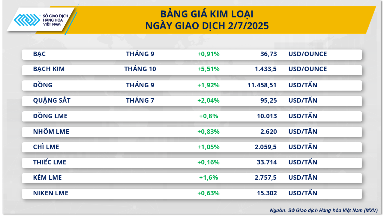 Trên thị trường kim loại cơ bản, giá đồng COMEX tiếp tục duy trì đà tăng ấn tượng khi ghi nhận mức tăng 1,92%, lên 11.458 USD/tấn. Đà tăng của giá đồng tiếp tục được củng cố bởi tâm lý lo ngại gia tăng khi thời hạn áp thuế đối ứng của Washington đang đến gần. Mặc dù việc áp thuế đối với mặt hàng đồng hiện mới dừng ở giai đoạn điều tra riêng biệt, thị trường vẫn quan ngại làn sóng thuế quan sẽ sớm mở rộng sang kim loại này, nhằm hỗ trợ mục tiêu giảm phụ thuộc vào nguồn nhập khẩu và thúc đẩy năng lực khai thác, sản xuất nội địa của Mỹ. Tuy nhiên, với thực tế hơn 40% nhu cầu tiêu thụ đồng tại Mỹ hiện vẫn dựa vào nguồn nhập khẩu, việc hiện thực hóa mục tiêu này được đánh giá là sẽ đối mặt với nhiều thách thức lớn.