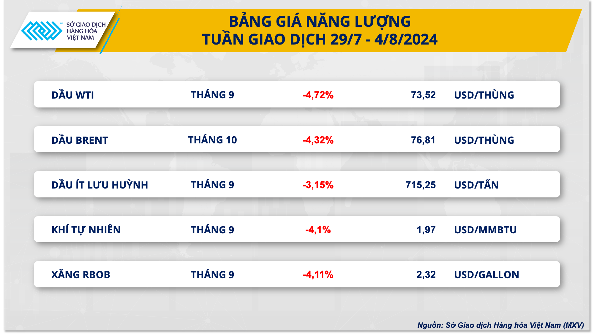 Kết thúc tuần giao dịch 29/7 - 4/8, thị trường dầu thế giới trải qua tuần giảm giá mạnh và chưa có dấu hiệu đi lên. Trong đó, giá dầu WTI giảm 4,72% về mức 73,52 USD/thùng. Dầu Brent giảm 4,32% xuống 76,81 USD/thùng.