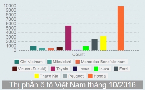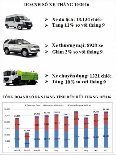 Theo báo cáo của Hiệp hội các nhà sản xuất ô tô Việt Nam (VAMA), trong tháng 10/2016, doanh số bán hàng của toàn thị trường đạt 28.283 xe, tăng 7% so với tháng 9/2016 và tăng 26% so với tháng 10/2015. Trong đó, sản lượng của xe lắp ráp trong nước đạt 20.879 xe, tăng 1,5% so với tháng trước và số lượng xe nhập khẩu nguyên chiếc là 7.404 xe, tăng 24% so với tháng trước.