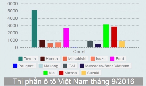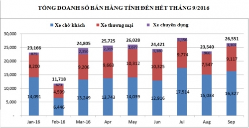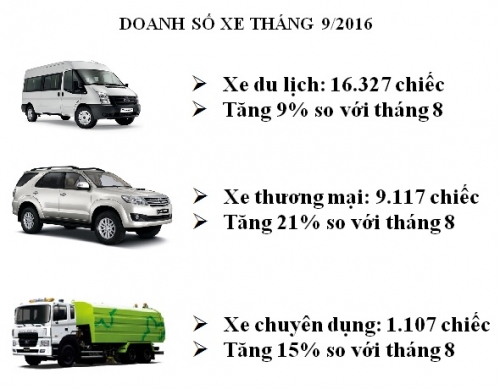 Theo báo cáo của Hiệp hội các nhà sản xuất ô tô Việt Nam (VAMA), trong tháng 9/2016, doanh số bán hàng của toàn thị trường đạt 26.551 xe, tăng 13% so với tháng 8/2016 và tăng 24% so với tháng 9/2015. Trong đó, xe lắp ráp trong nước đạt 20.566 xe, tăng 17% so với tháng trước và số lượng xe nhập khẩu nguyên chiếc là 5.985 xe, xấp xỉ so với tháng trước.
