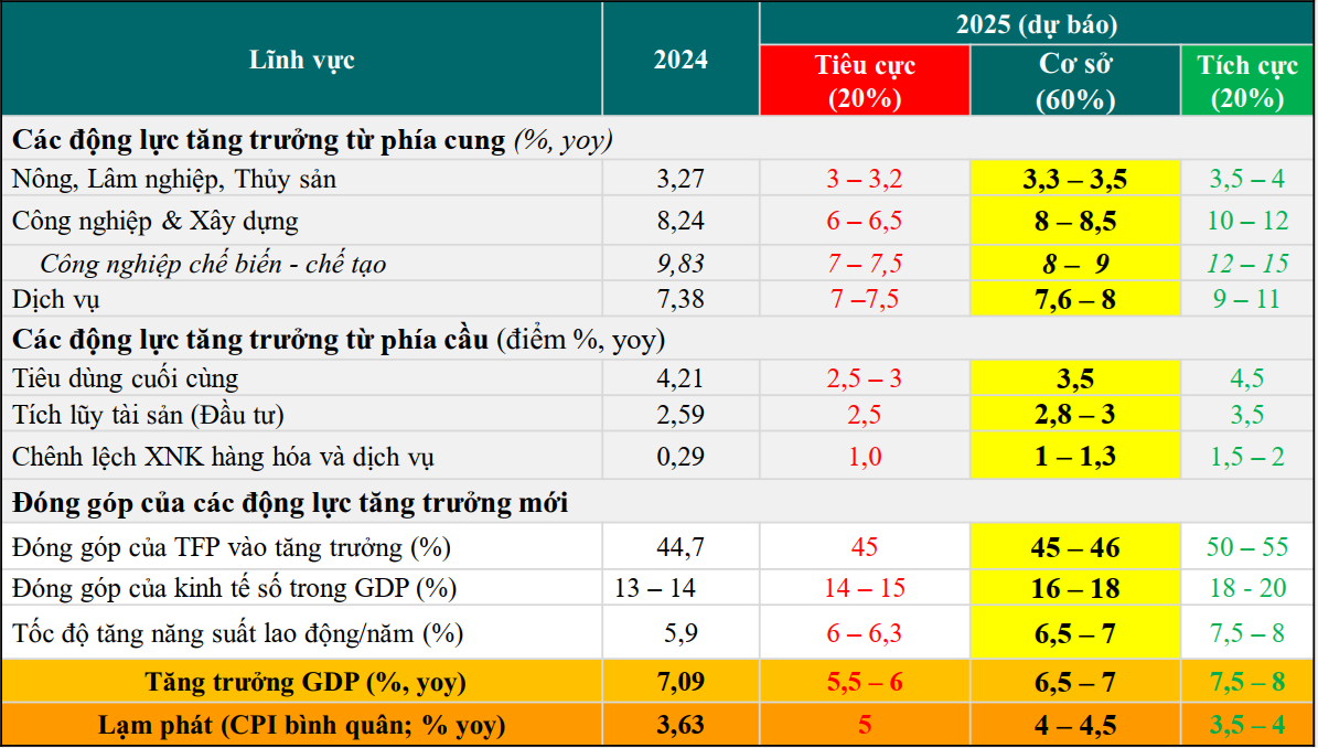 Với kịch bản tích cực (xác suất 20%), mức thuế quan chỉ khoảng 10%, tăng trưởng GDP có thể đạt 7,5-8%. Với kịch bản tiêu cực (xác suất 20%), Mỹ vẫn sẽ áp mức thuế đối ứng 46% (hoặc chỉ giảm nhẹ), tăng trưởng GDP sẽ bị ảnh hưởng rất tiêu cực, giảm 1,5-2 điểm %, chỉ đạt 5,5-6% năm 2025.