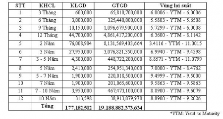 Tổng khối lượng giao dịch TPCP theo phương thức giao dịch mua bán lại (repos) đạt 58,8 triệu trái phiếu, tương đương với giá trị giao dịch đạt hơn 5.974 tỷ đồng. Trong đó, giá giao dịch trái phiếu chính phủ bảo lãnh (TPCPBL) theo phương thức outright đạt hơn 2.707 tỷ đồng, theo phương thức repos đạt hơn 772,6 tỷ đồng.