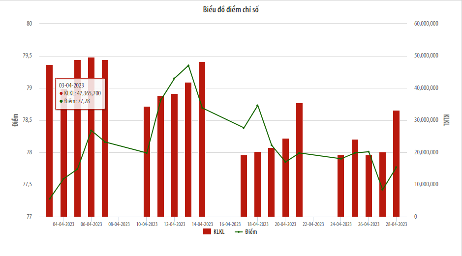 Khối lượng giao dịch bình quân đạt xấp xỉ 44,13 triệu cổ phiếu/phiên, giá trị giao dịch bình quân đạt hơn 731 tỷ đồng/phiên, tăng 55,29% về khối lượng giao dịch và 120,81% về giá trị giao dịch so với tháng 3/2023. Trong đó, phiên giao dịch có khối lượng giao dịch cao nhất tháng đạt 68,2 triệu cổ phiếu tại ngày 21/4/2023 và giá trị giao dịch cao nhất thuộc về ngày 12/4/2023 với hơn 2.300 tỷ đồng.