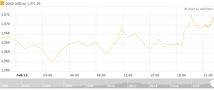 Theo khảo sát của thoibaonganhang.vn, tính đến 10h sáng nay (13/2) giá vàng giao ngay tăng 5,9 USD/oz (0,38%) lên mức 1571,7 USD/oz. Giao dịch trong phiên dao động quanh ngưỡng 1.561,4 - 1.573,2 USD/oz.