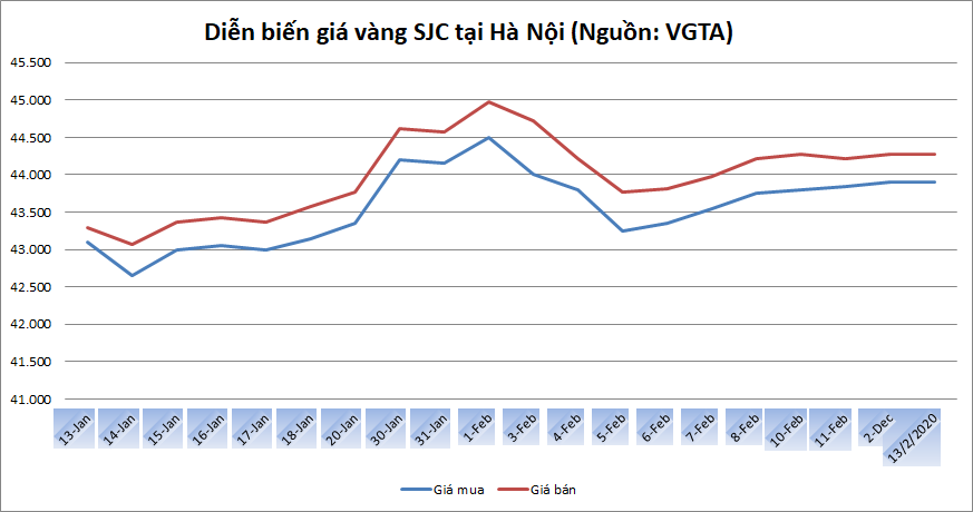 Giá vàng tại khu vực Hà Nội được Tập đoàn này niêm yết ở mức 43,90 - 44,15 triệu đồng/lượng, tăng 20 nghìn đồng/lượng ở cả giá mua và giá bán so với cùng thời điểm phiên trước đó.