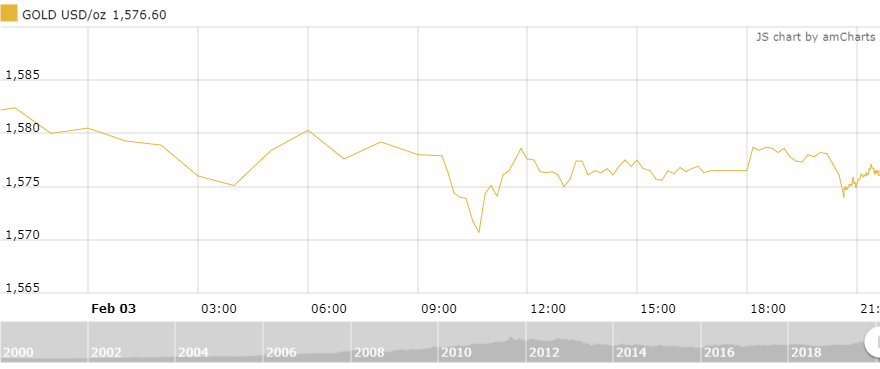 Theo khảo sát của thoibaonganhang.vn, tính đến 9h sáng nay (4/2) giá vàng giao ngay giảm 0,2 USD/oz (0,01%) xuống mức 1576,3 USD/oz. Giao dịch trong phiên dao động quanh ngưỡng 1.569,4 - 1.581,8 USD/oz.