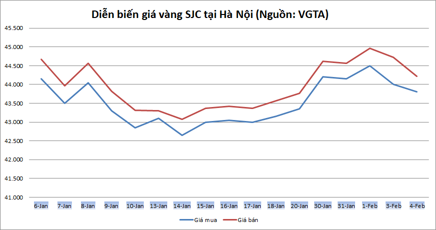 Giá vàng tại khu vực Hà Nội được Tập đoàn này niêm yết ở mức 43,80 - 44,30 triệu đồng/lượng, giảm 200 nghìn đồng/lượng ở giá mua và 700 nghìn đồng/lượng ở giá bán so với cùng thời điểm phiên trước đó.
