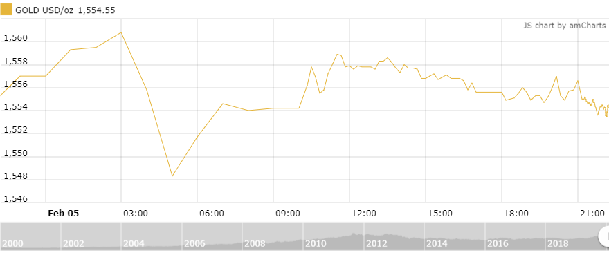 Theo khảo sát của thoibaonganhang.vn, tính đến 10h sáng nay (6/2) giá vàng giao ngay giảm 0,9USD/oz (0,06%) xuống mức 1554,7 USD/oz. Giao dịch trong phiên dao động quanh ngưỡng 1.547,2 - 1.563,1 USD/oz.