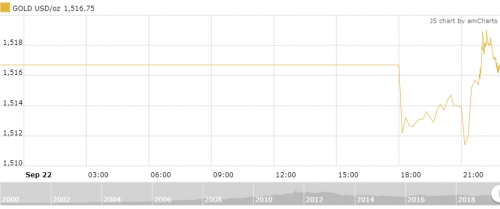Theo khảo sát của thoibaonganhang.vn, tính đến 10h sáng nay (23/9) giá vàng giao ngay trên thị trường thế giới tăng đã giảm 1 USD/oz xuống mức 1516 USD/oz so với cuối phiên trước. Giao dịch trong phiên dao động quanh ngưỡng 1.511 - 1.520,3 USD/oz.