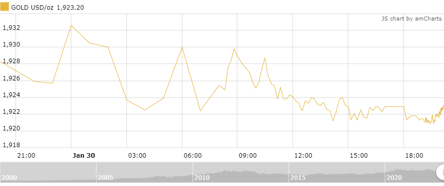 Tính đến 8h sáng nay (31/1) theo giờ Việt Nam, giá vàng giao ngay tăng +0,1 USD (+0,01%) so với mở cửa lên 1923,1 USD/oz, giao dịch đang dao động trong khoảng 1.919,8 - 1.933,4 USD/oz.