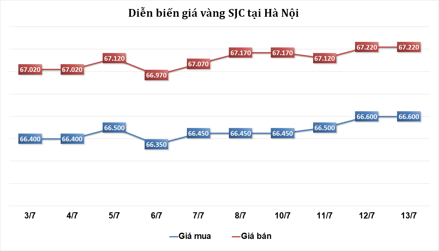 Tại Hà Nội, giá vàng SJC được niêm yết ở mức 66,60 - 67,22 triệu đồng/lượng, không đổi so với cuối phiên trước.