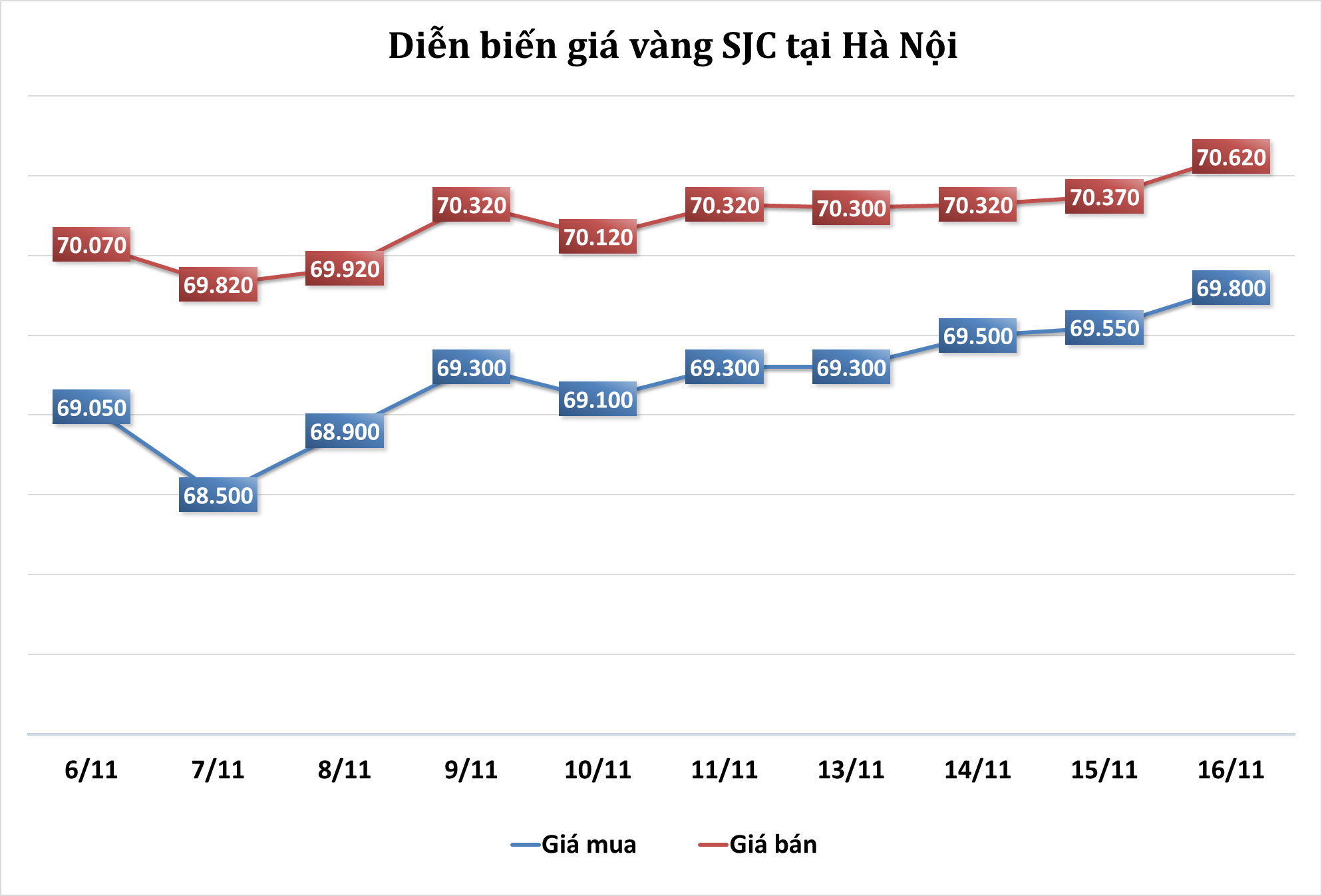 Tại Hà Nội, giá vàng SJC được niêm yết ở mức 69,80 - 70,62 triệu đồng/lượng, không đổi so với cuối phiên trước, nhưng đã tăng 250 nghìn đồng/lượng ở giá mua so với cùng thời điểm ngày hôm qua.
