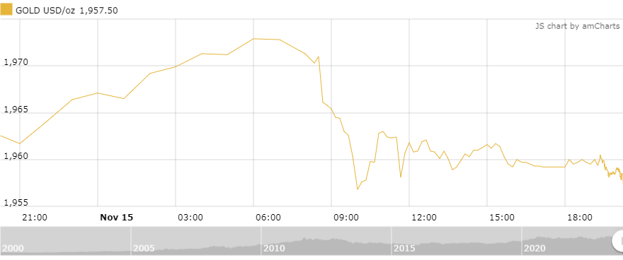 Tính đến 8h sáng nay (16/11) theo giờ Việt Nam, giá vàng giao ngay giảm 1,6 USD/oz (-0,08%) so với mở cửa, hiện ở mức 1.957,6 USD/oz, giao dịch đang dao động trong khoảng 1.954,8-1.976,2 USD/oz.
