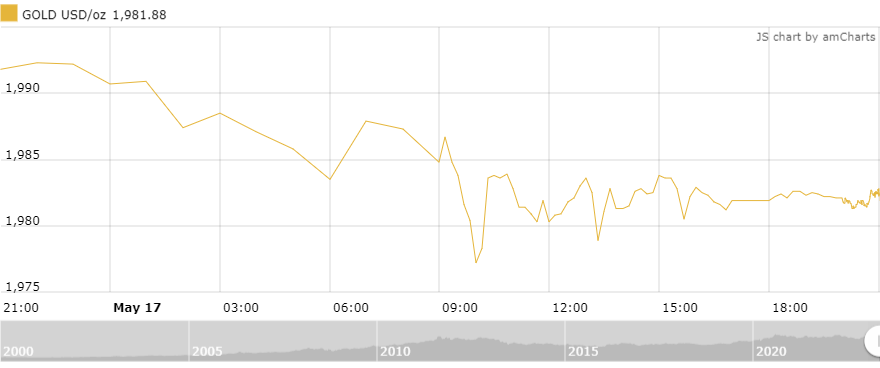 Tính đến 8h sáng nay (18/5) theo giờ Việt Nam, giá vàng giao ngay tăng 1,2 USD (+0,06%) so với mở cửa lên 1.983,1 USD/oz, giao dịch đang dao động trong khoảng 1.974,6-1.992,6 USD/oz.