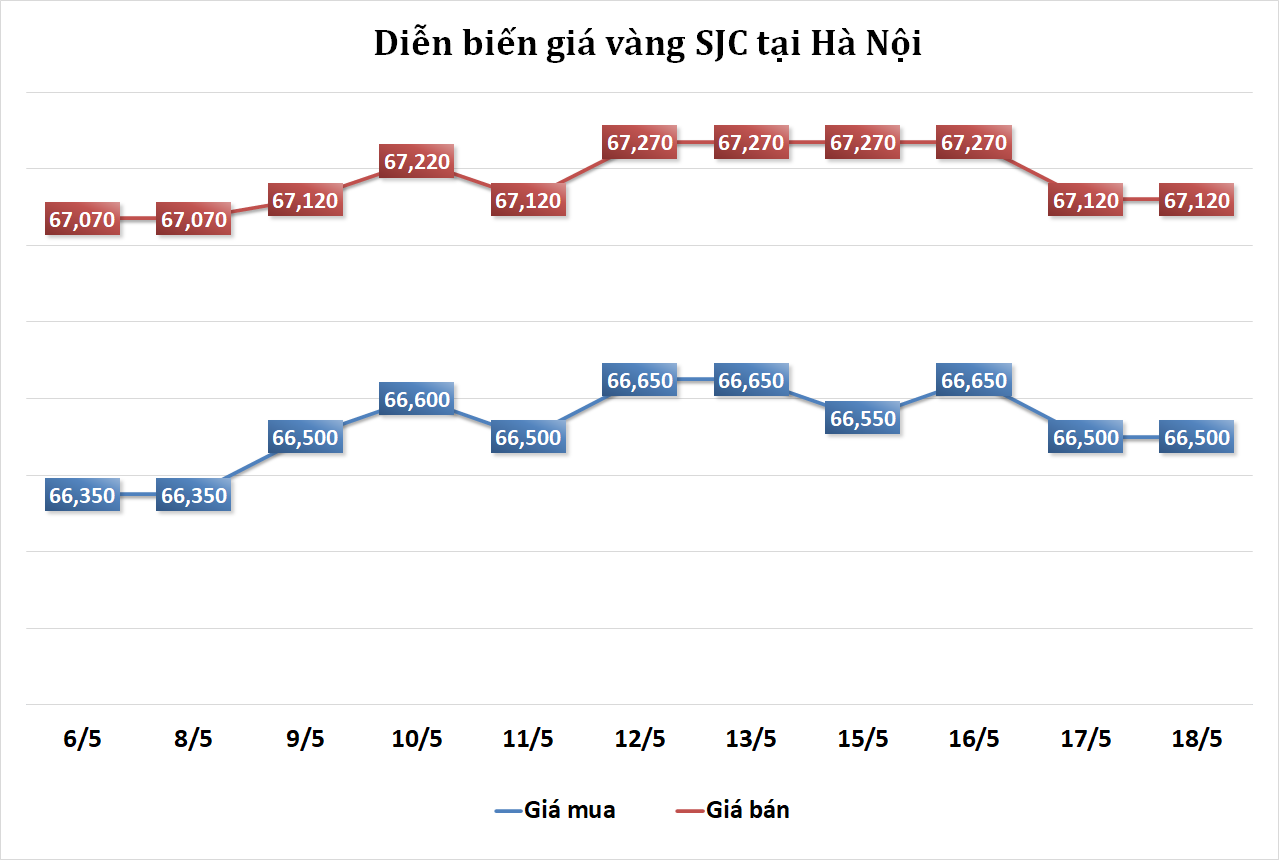 Tại Hà Nội, giá vàng SJC được niêm yết ở mức 66,50 - 67,12 triệu đồng/lượng, không đổi so với cuối phiên trước nhưng đã giảm 50 nghìn đồng/lượng ở cả 2 chiều mua và bán so với cùng thời điểm ngày hôm qua.