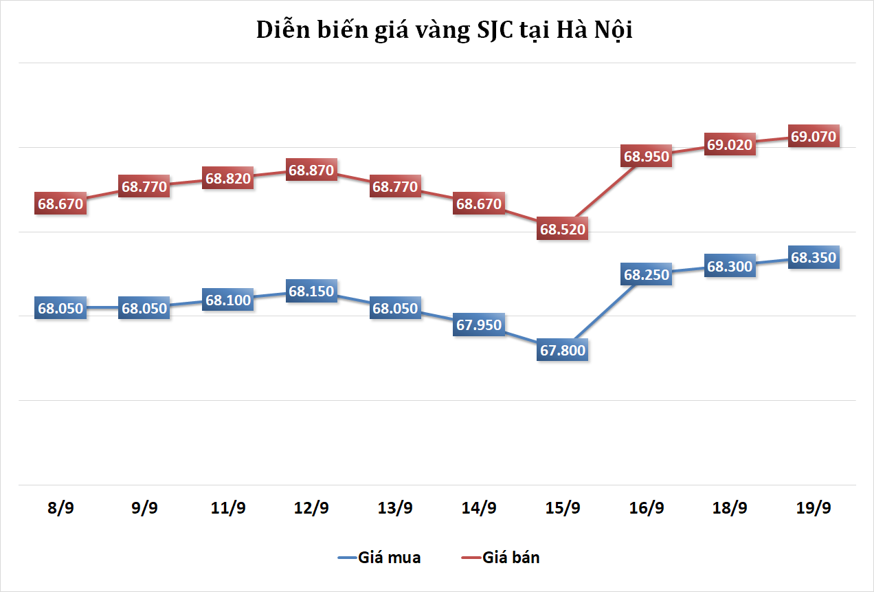 Tại Hà Nội, giá vàng SJC được niêm yết ở mức 68,35 - 69,07 triệu đồng/lượng, không đổi so với cuối phiên trước nhưng đã tăng 50 nghìn đồng/lượng ở cả 2 chiều mua vào và bán ra so với cùng thời điểm ngày hôm qua.