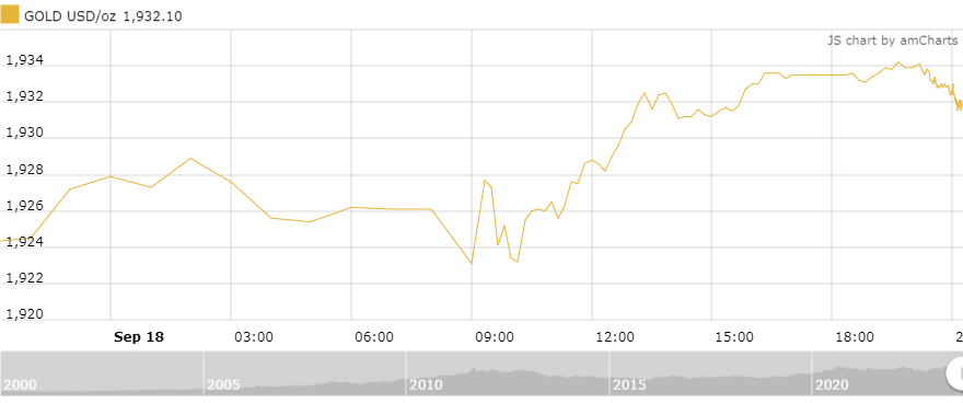 Tính đến 8h sáng nay (19/9) theo giờ Việt Nam, giá vàng giao ngay giảm 1,4 USD (-0,07%) so với mở cửa, hiện ở mức 1.932,4 USD/oz, giao dịch đang dao động trong khoảng 1.922,1-1.935,3 USD/oz.