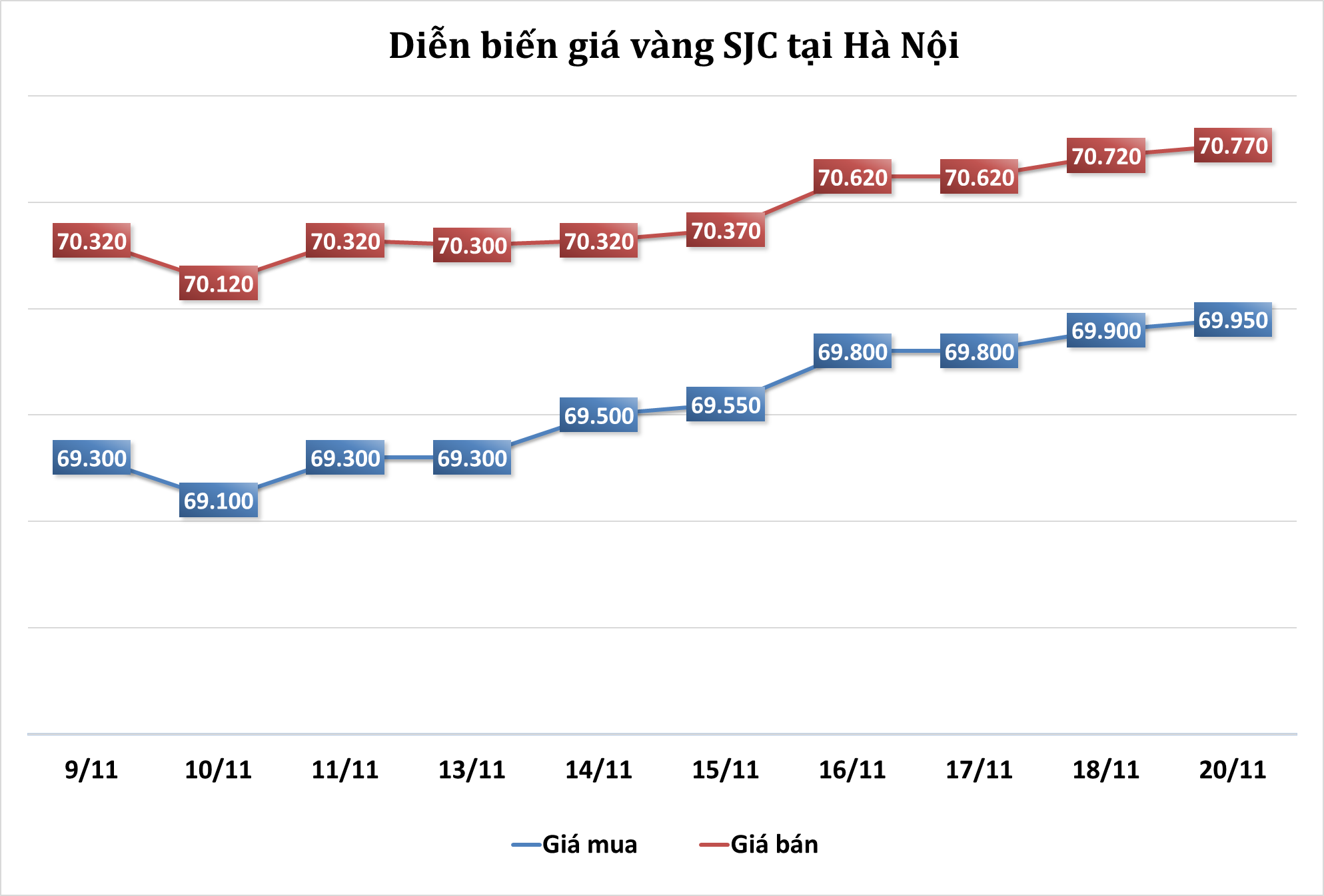 Tại Hà Nội, giá vàng SJC được niêm yết ở mức 69,95 - 70,77 triệu đồng/lượng, tăng 50 nghìn đồng/lượng ở cả hai chiều mua-bán so với phiên trước.