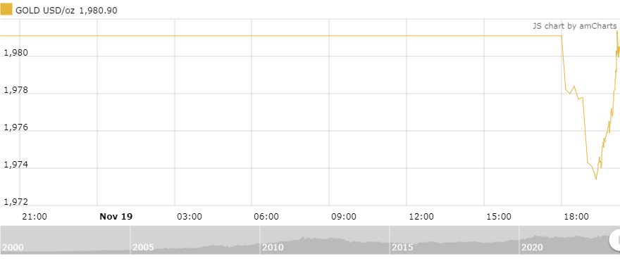 Tính đến 8h sáng nay (20/11) theo giờ Việt Nam, giá vàng giao ngay giảm 0,2 USD/oz (-0,01%) so với mở cửa, hiện ở mức 1.981,1 USD/oz, giao dịch đang dao động trong khoảng 1.973,1-1.982,5 USD/oz.