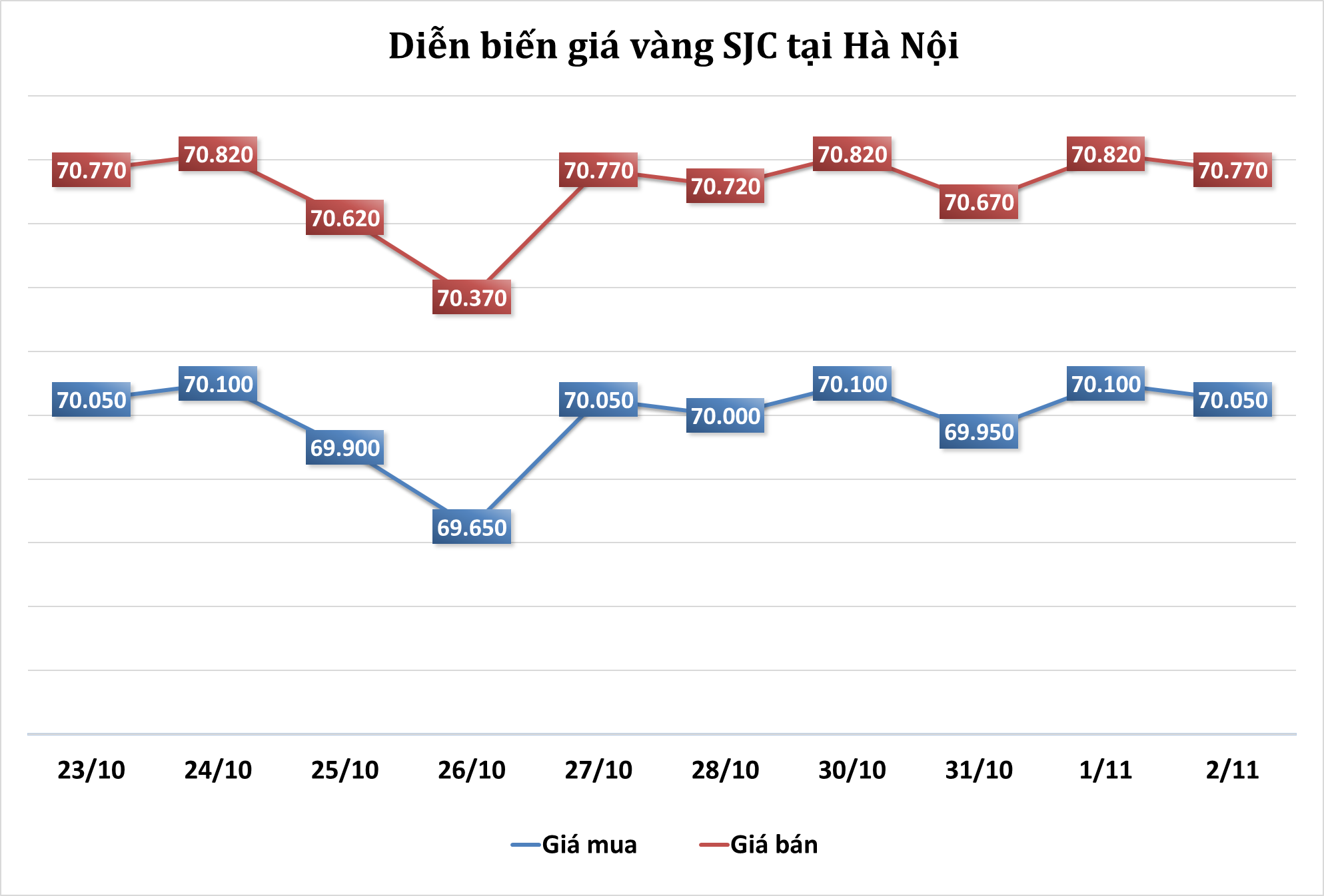 Tại Hà Nội, giá vàng SJC được niêm yết ở mức 70,05 - 70,77 triệu đồng/lượng, không đổi so với cuối phiên trước nhưng đã giảm 50 nghìn đồng/lượng ở cả 2 chiều mua và bán so với cùng thời điểm ngày hôm qua.