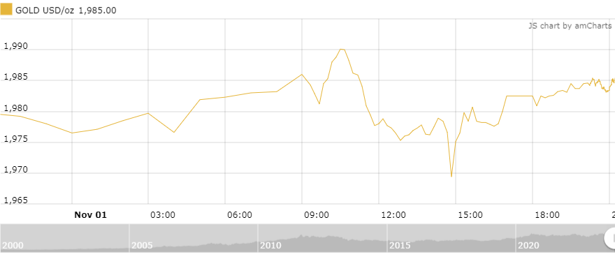Tính đến 8h sáng nay (2/11) theo giờ Việt Nam, giá vàng giao ngay tăng 2,5 USD/oz (+0,13%) so với mở cửa, hiện ở mức 1.985 USD/oz, giao dịch đang dao động trong khoảng 1.969,1-1.992,7 USD/oz.